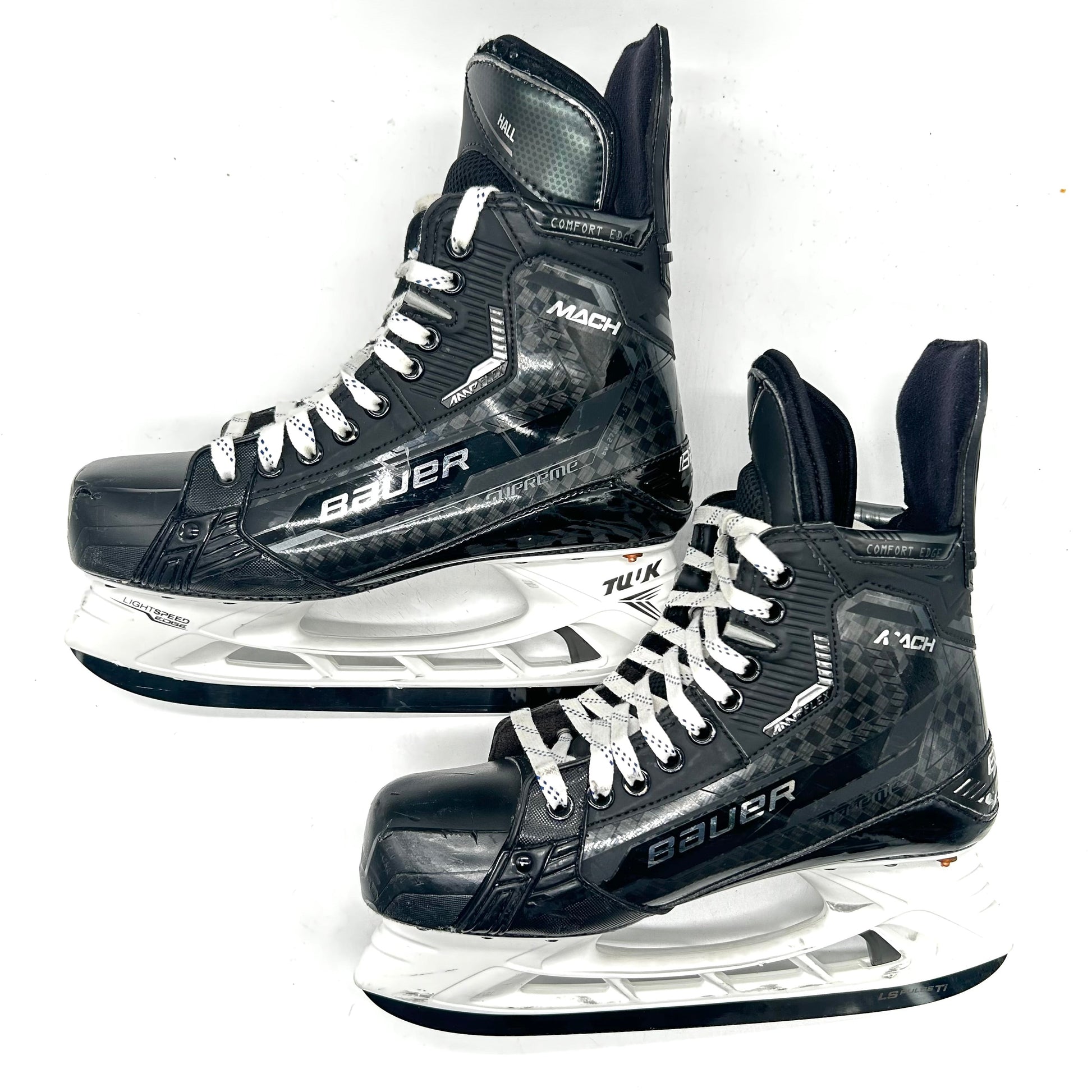 These skates are in very good used condition with minor cosmetic blemishes. These skates are sized 9.25E with 288 Lightspeed Edge holders and used Pulse Ti steel. They feature “Hall” printed on both tongues.
