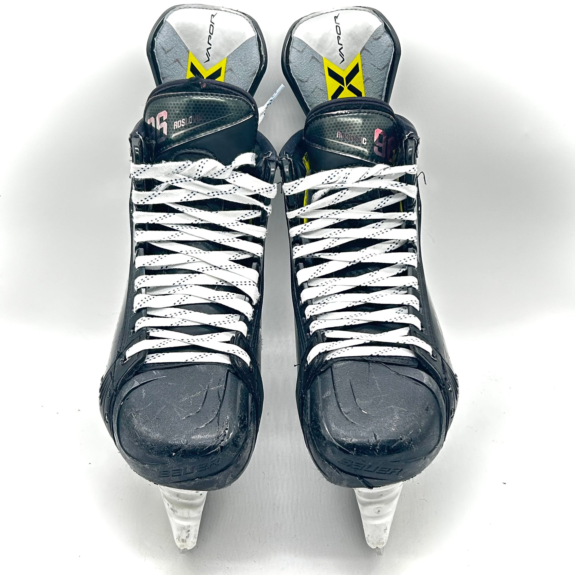 These skates are in very good used condition with minor cosmetic blemishes to the boot and tongue while the toe boxes are also in good condition. These skates are sized 9.5 with 288 Lightspeed Edge holders and used Ramonedge steel. They feature “96 Roslovic” printed on both tongues.