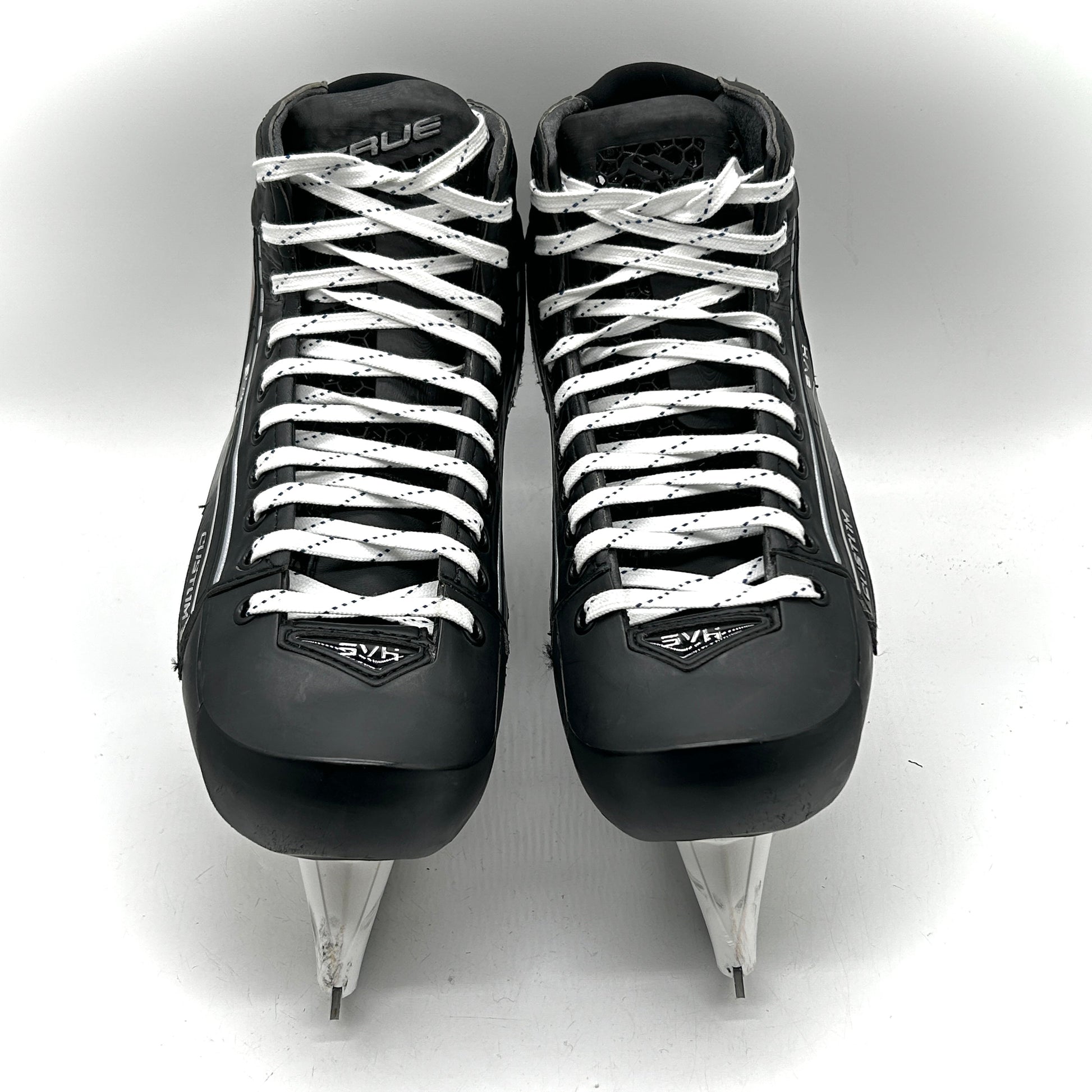 These skates are in good used condition with general wear. These skates are sized 11 with 11 Vertexx Edge holders and Pulse Ti steel. These skates feature the custom 3D printed TRUE tongue.