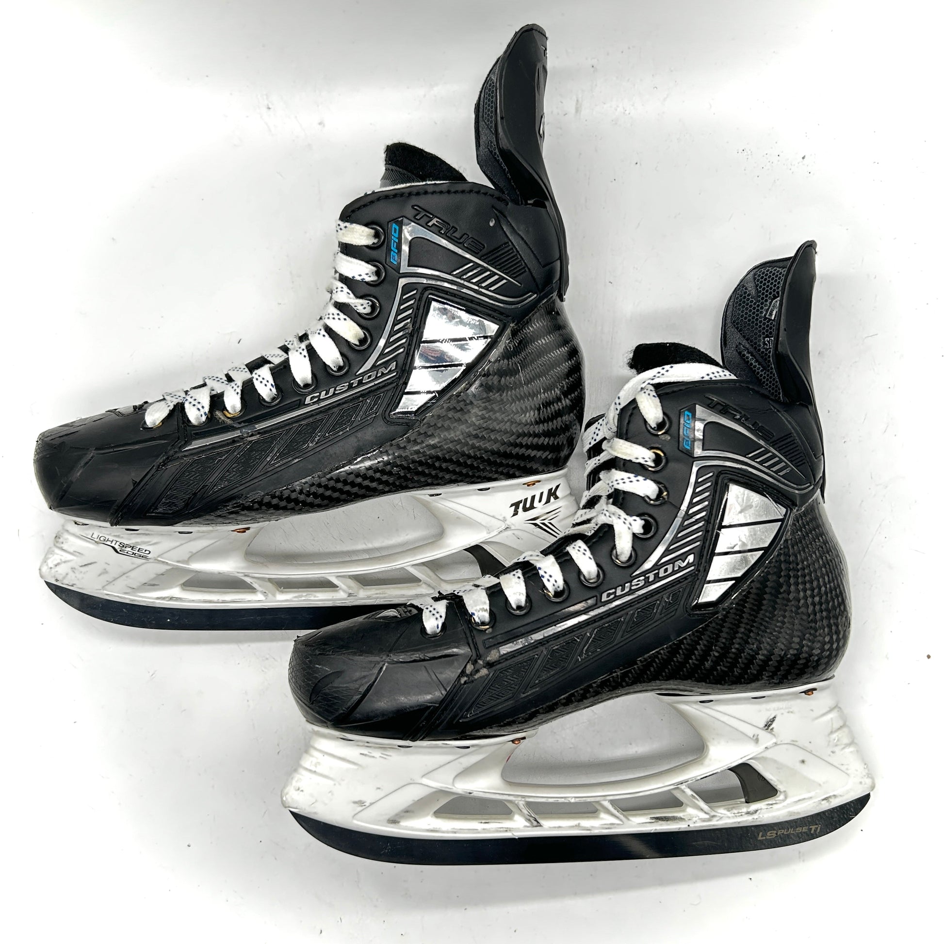 These skates are in good used condition with general wear. These skates are sized 9.5 with 280 Lightspeed Edge Holders and Pulse Ti steel.
