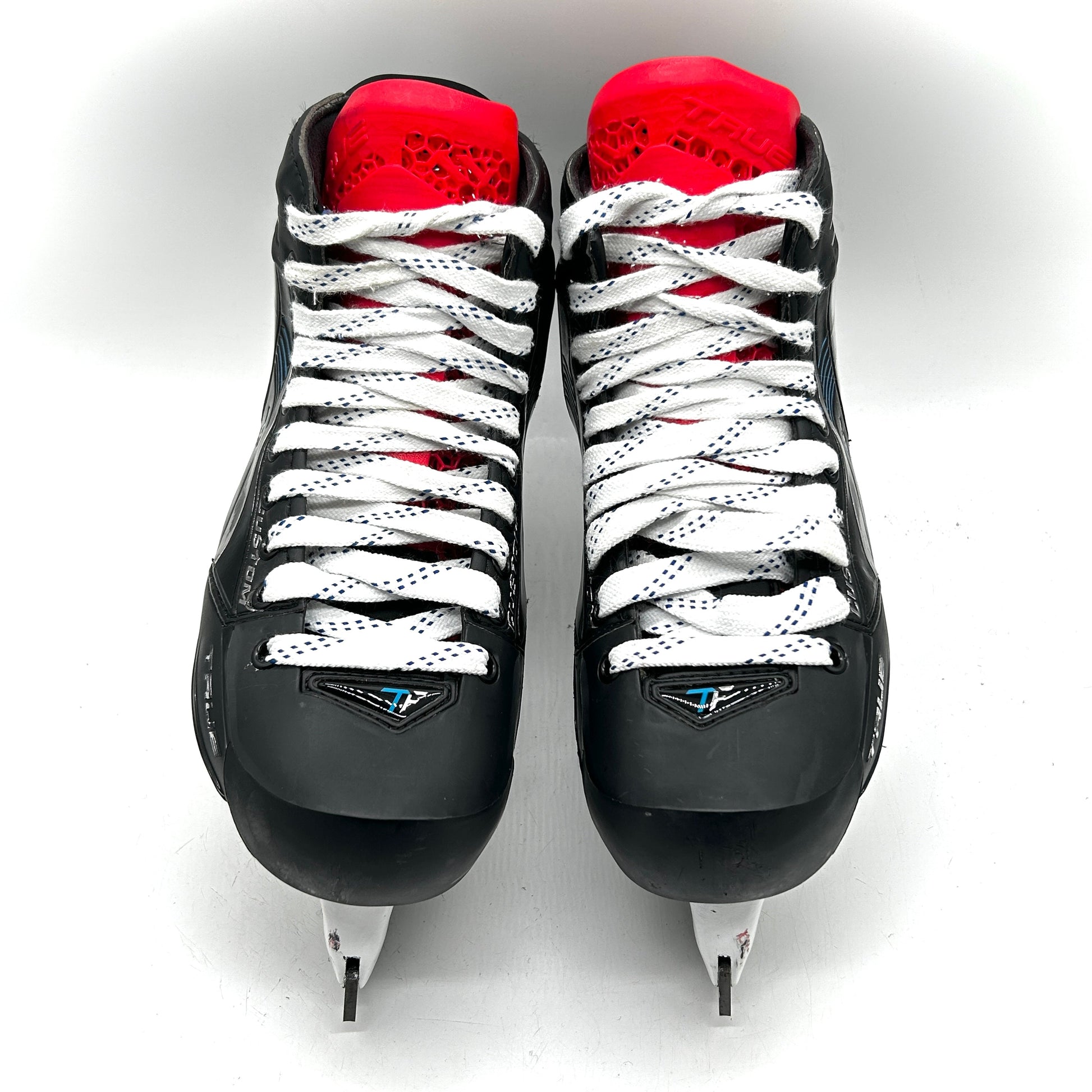 These skates are in good used condition with general wear. These skates are sized 9.5 with a one piece boot and shift DLC steel. These skates feature the custom 3D printed TRUE tongue in the Carolina Hurricanes Red..